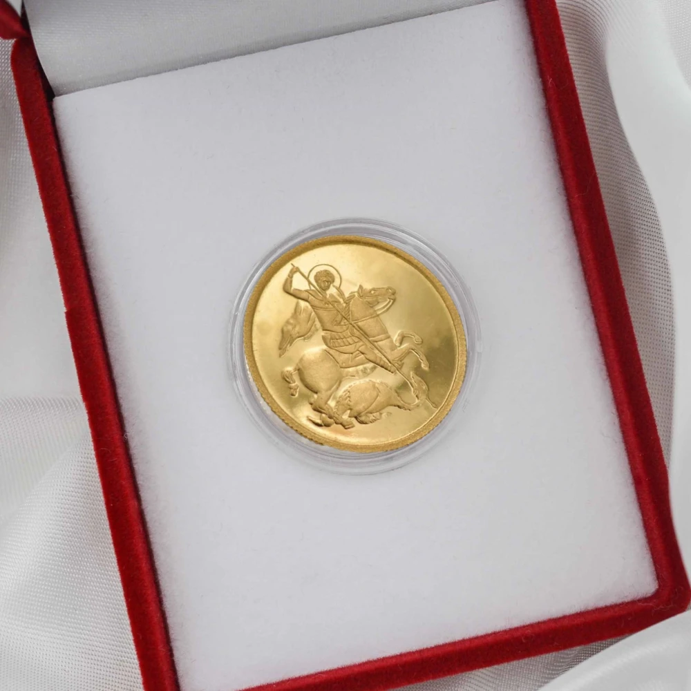 Zlatnik Sveti Georgije izrađen je od zlata finoće 900, sa detaljno isklesanim motivom koji odaje počast hrabrosti i vere – Svetom Georgiju, zaštitniku i simbolu pobede nad zlom. Ovaj prefinjeni zlatnik predstavlja snagu, čast i nepresušnu duhovnu inspiraciju.